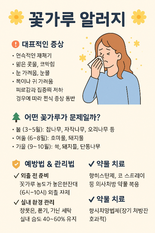 꽃가루 알레르기는 꽃가루에 포함된 단백질에 면역체계가 과민 반응을 보이면서 생기는 계절성 알레르기 비염입니다. 주로 봄, 초여름, 가을에 심해지며, 나무, 풀, 잡초에서 날리는 꽃가루가 주요 원인이 됩니다.