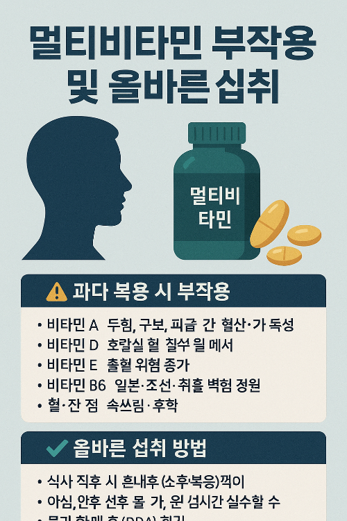 멀티비타민은 일반적으로 안전하지만, 과다 복용하거나 여러 제품을 중복해서 섭취할 경우 주의가 필요합니다.