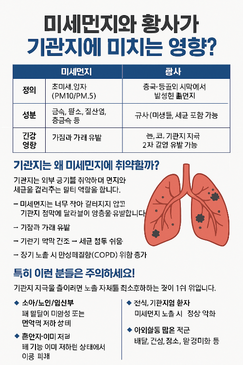 특히 어린이, 노약자, 천식·기관지염 환자에게는 미세먼지와 황사가 직접적인 위험요인이 됩니다.