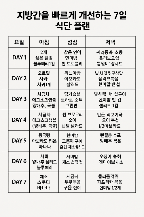 아래는 비알코올성 지방간(NAFLD)을 빠르게 개선하기 위한 7일 식단 플랜입니다.